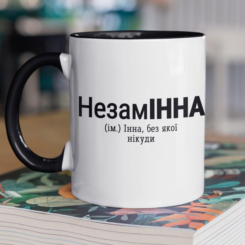 Чашка керамічна з принтом "незамінна" 330 мл, біла з чорною ручкою