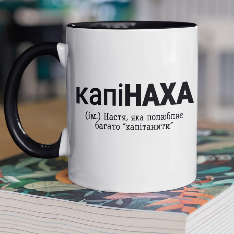 Чашка керамічна з принтом "капінаха" 330 мл, біла з чорною ручкою