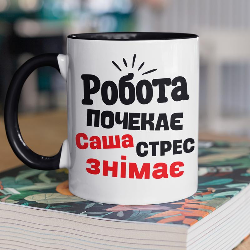 Чашка керамічна з принтом "саша стрес знімає" 330 мл, біла з чорною ручкою