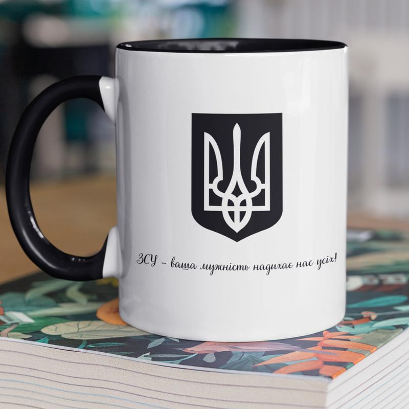 Чашка керамічна з принтом "зсу мужність" 330 мл, біла з чорною ручкою