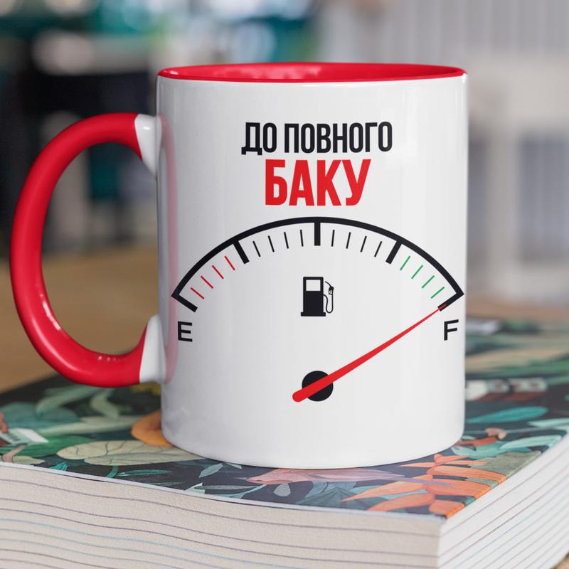 Чашка керамічна з принтом "до повного баку" 330 мл, біла з червоною ручкою