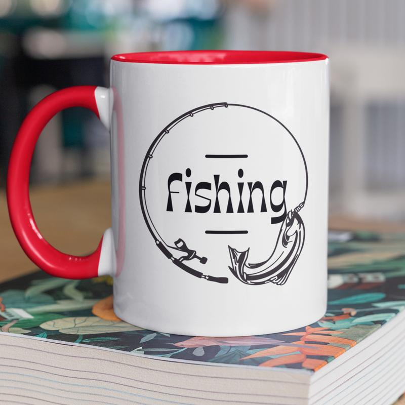 Чашка керамічна з принтом "fishing" 330 мл, біла з червоною ручкою