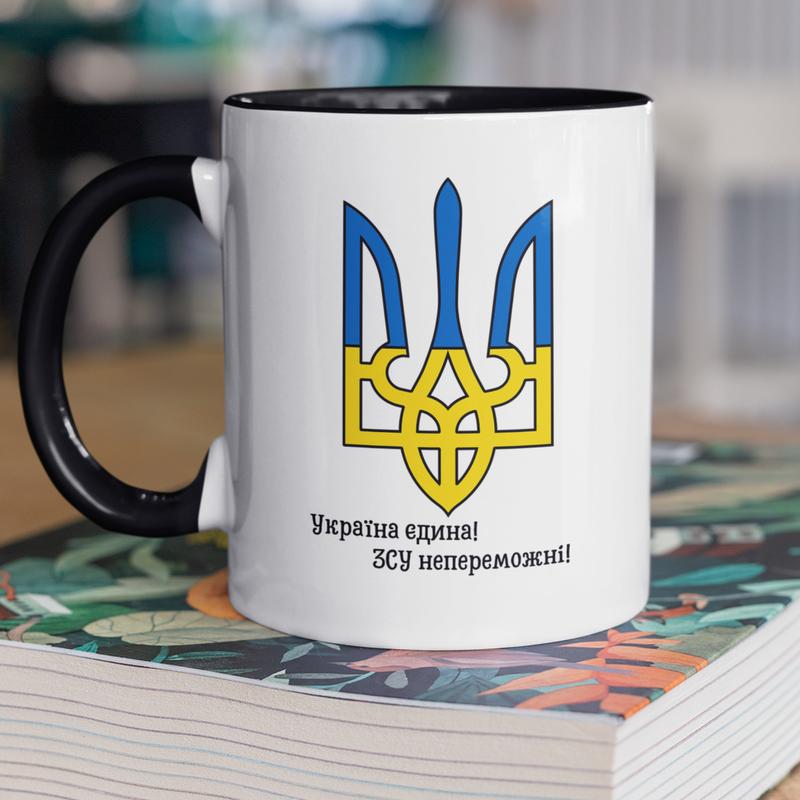 Чашка керамічна з принтом "україна єдина" 330 мл, біла з чорною ручкою