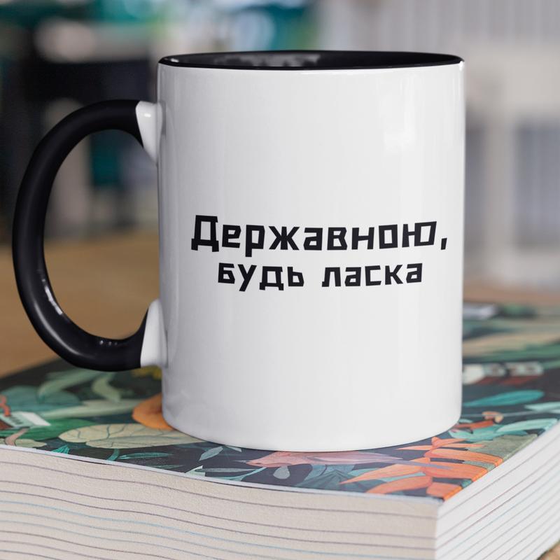 Чашка керамічна з принтом "державною будь ласка" 330 мл, біла з чорною ручкою