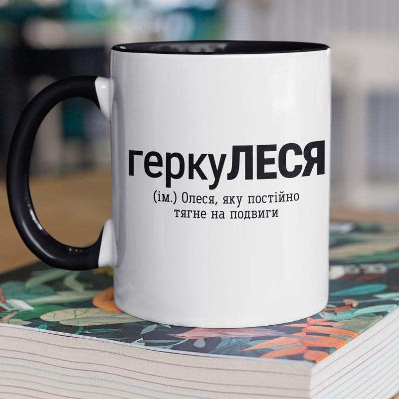 Чашка керамическая с принтом "геркулеся" 330 мл, белая с черной ручкой