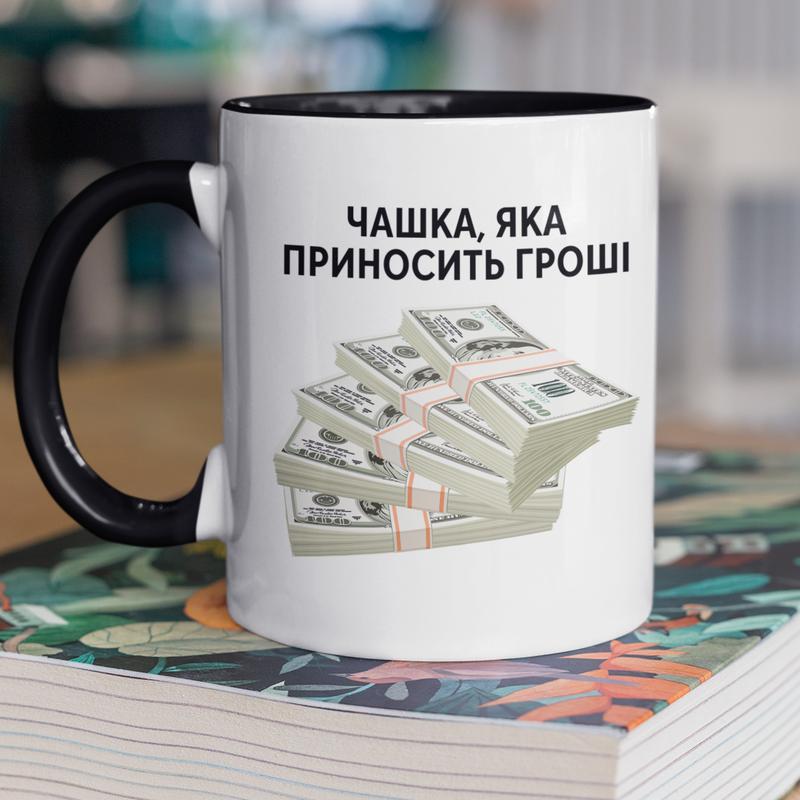 Чашка керамічна з принтом "чашка яка приносить гроші" 330 мл, біла з чорною ручкою