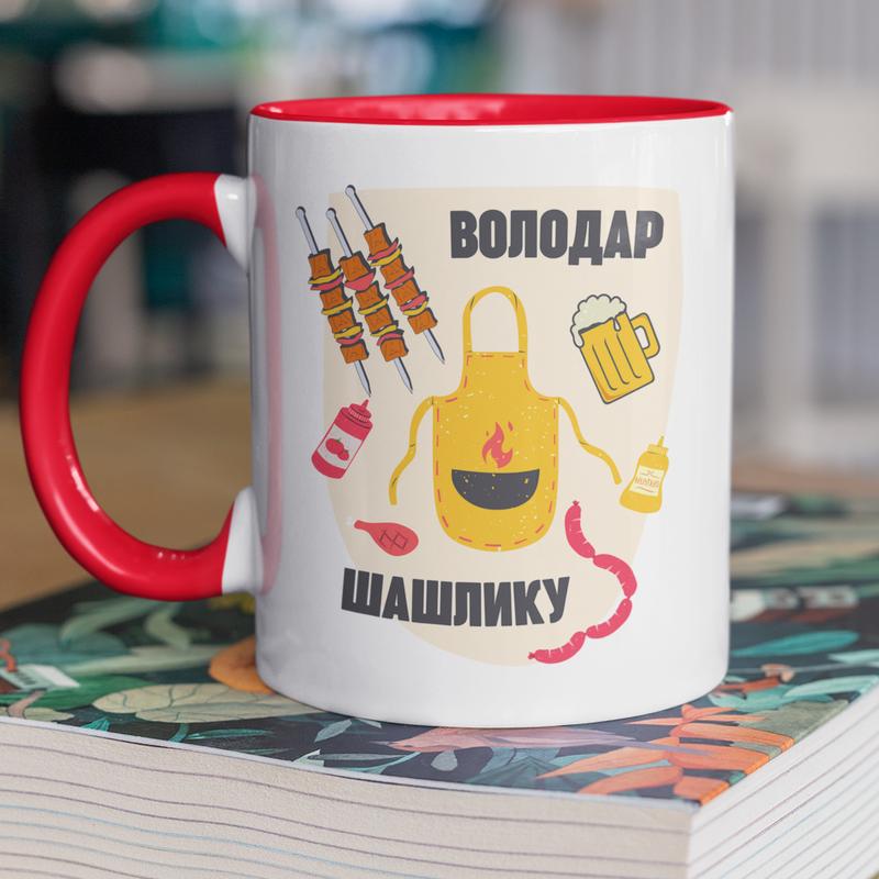 Чашка керамічна з принтом "володар шашлику" 330 мл, біла з червоною ручкою