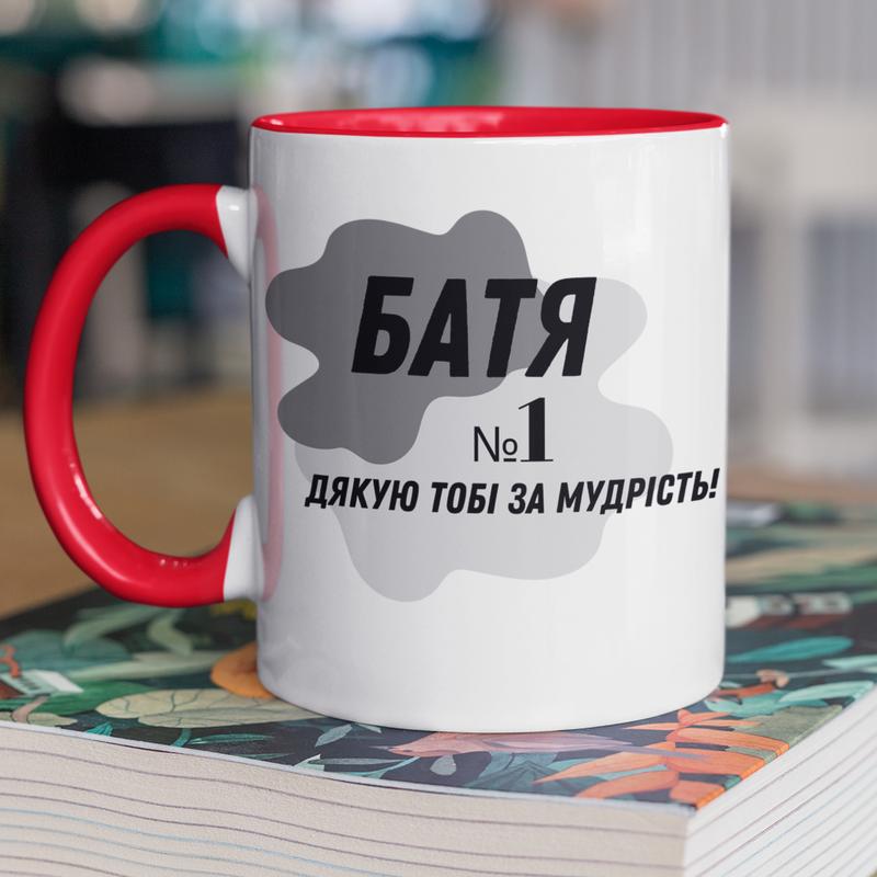 Чашка керамічна з принтом "батя №1 дякую тобі за мудрість" 330 мл, біла з червоною ручкою
