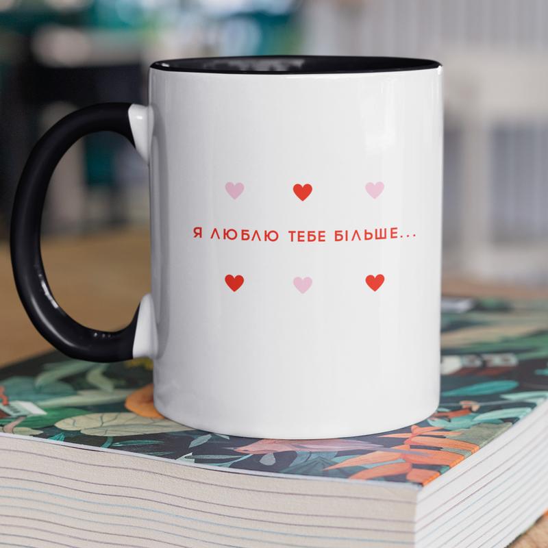 Чашка керамічна з принтом "я люблю тебе більше цю чашку кави" 330 мл, біла з чорною ручкою