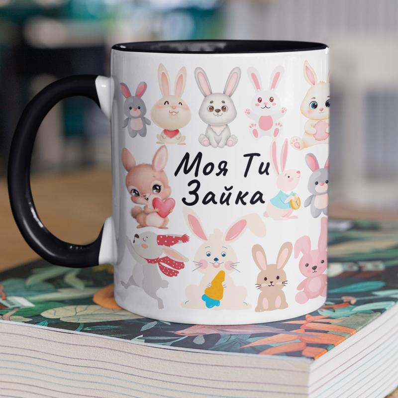 Чашка керамическая с принтом "моя ты зайка" 330 мл, белая с черной ручкой