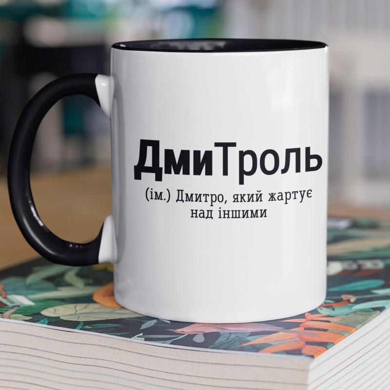 Чашка керамическая с принтом "дмитроль" 330 мл, белая с черной ручкой