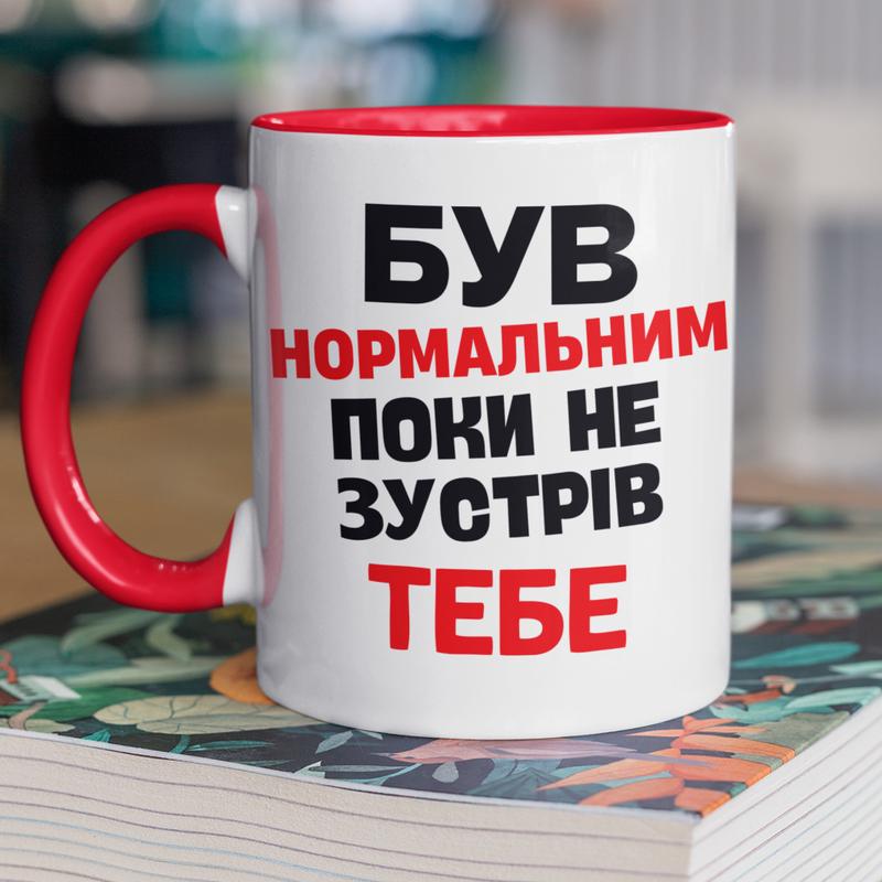 Чашка керамічна з принтом "був нормальним поки не зустрів тебе" 330 мл, біла з червоною ру...