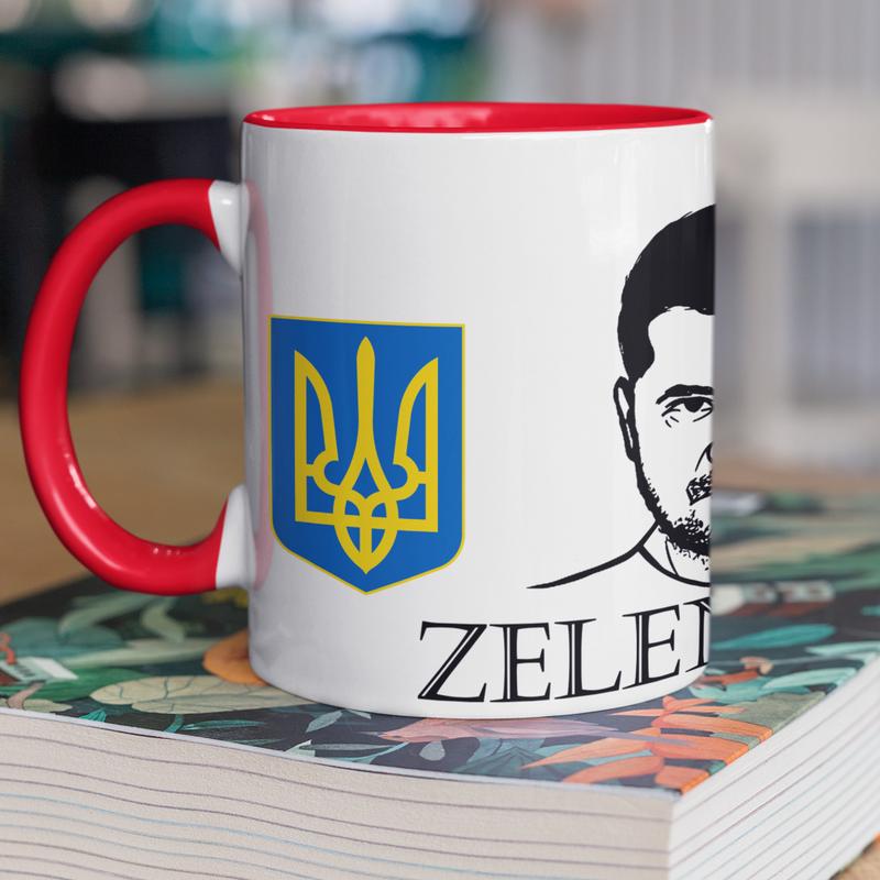 Чашка керамічна з принтом "зеленський" 330 мл, біла з червоною ручкою