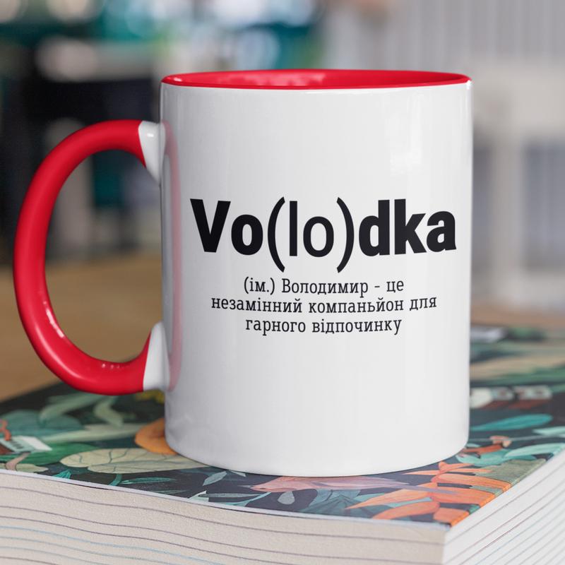 Чашка керамічна з принтом "vo(lo)dka" 330 мл, біла з червоною ручкою