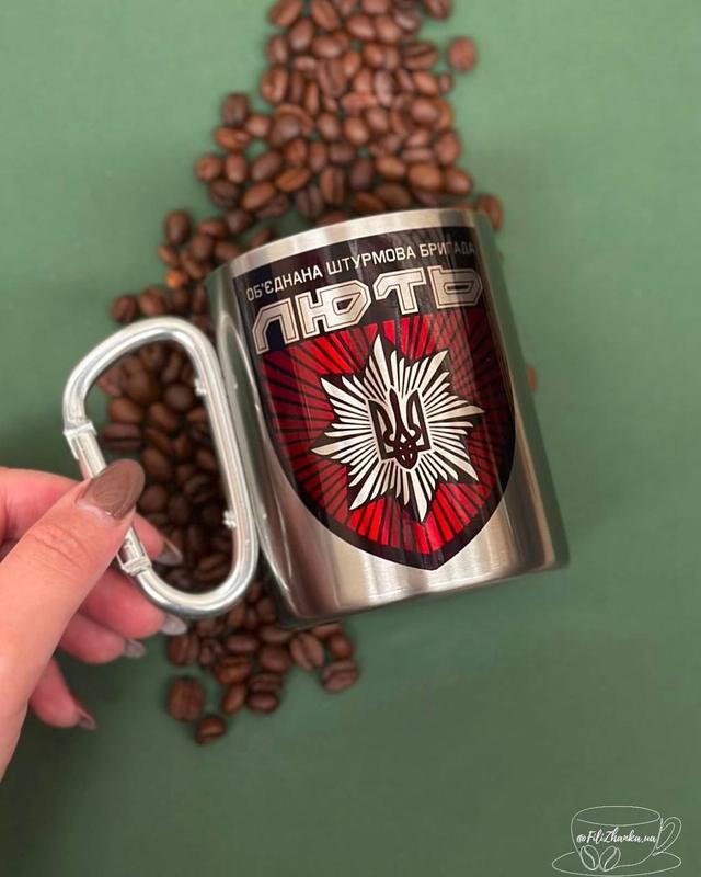 Металева чашка з карабіном⛓️ 💸Ціна: 380 грн (стандартне пакування) 💸Ціна: 405 грн (подарункове пакування🎁) Обʼєм: 300 мл 🇺🇦 Власне виробництво 🇺🇦 🖨️Можливий друк з вашими фото та текстом (розробка макету безкоштовна) 🚀Миттєве виготовлення та швидка відправка 🚚Відправка Новою Поштою/Укрпоштою
