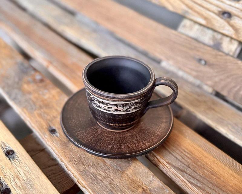 Чашка для кави 150 мл з блюдцем ангоб, червона глина, глиняний посуд, кераміка