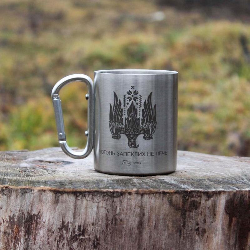 Металева чашка 250 мл з карабіном і гравіюванням - вогонь запеклих не пече