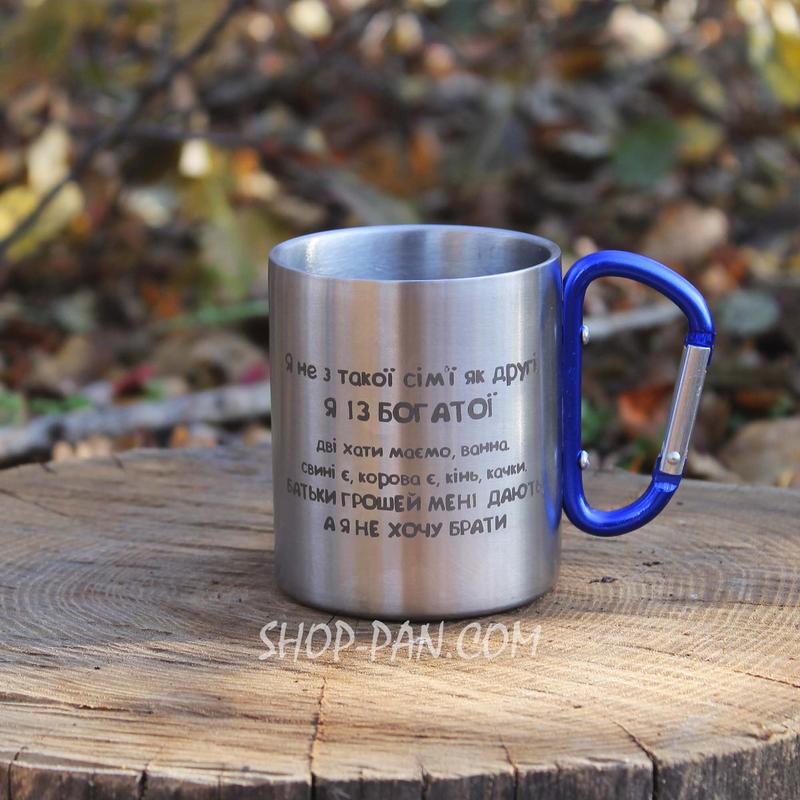 Металлическая чашка 250 мл с карабином и гравировкой - я не з такої сім'ї як другі я із бо...