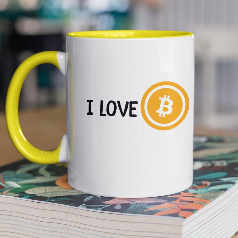 Чашка керамічна з принтом "i love bitcoin" 330 мл, біла з жовтою ручкою
