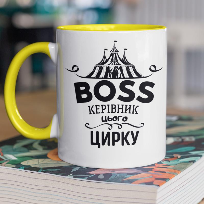 Чашка керамічна з принтом "керівник цирку" 330 мл, біла з жовтою ручкою