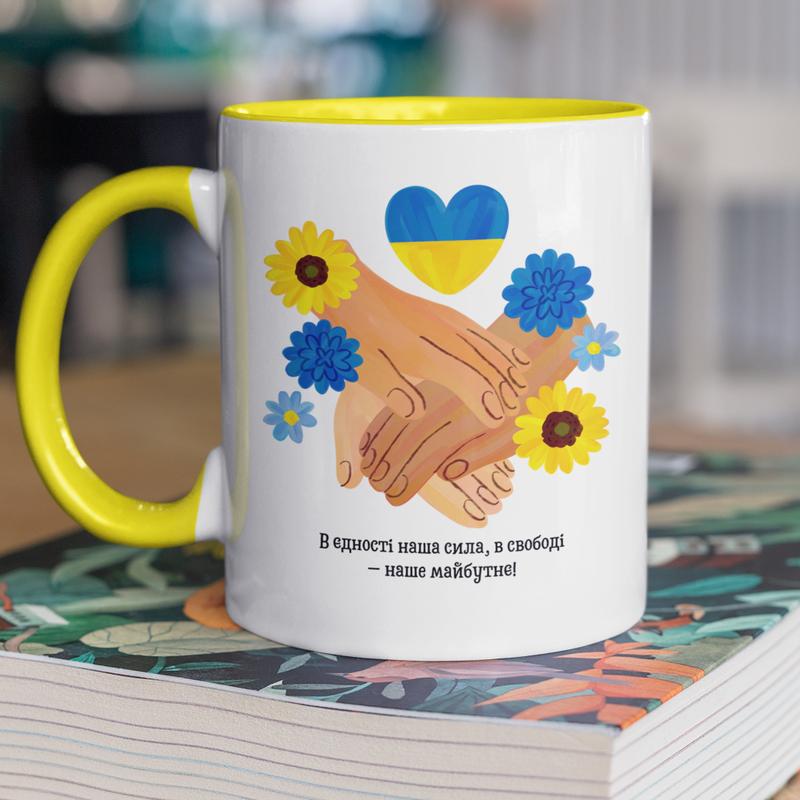 Чашка керамічна з принтом "в єдності сила" 330 мл, біла з жовтою ручкою