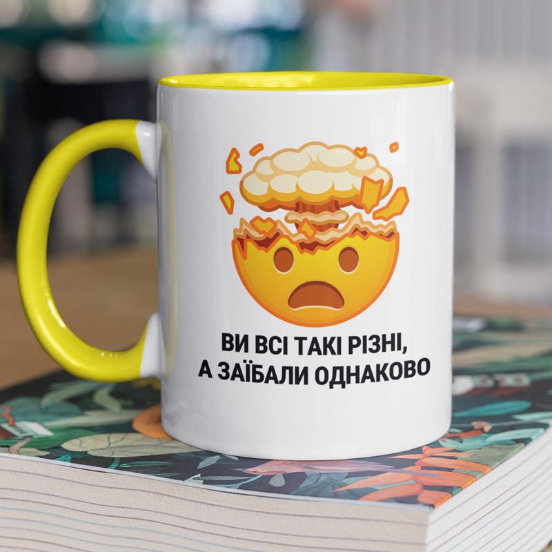 Чашка керамічна з принтом "ви всі такі різні а заїбали однаково" 330 мл, біла з жовтою руч...