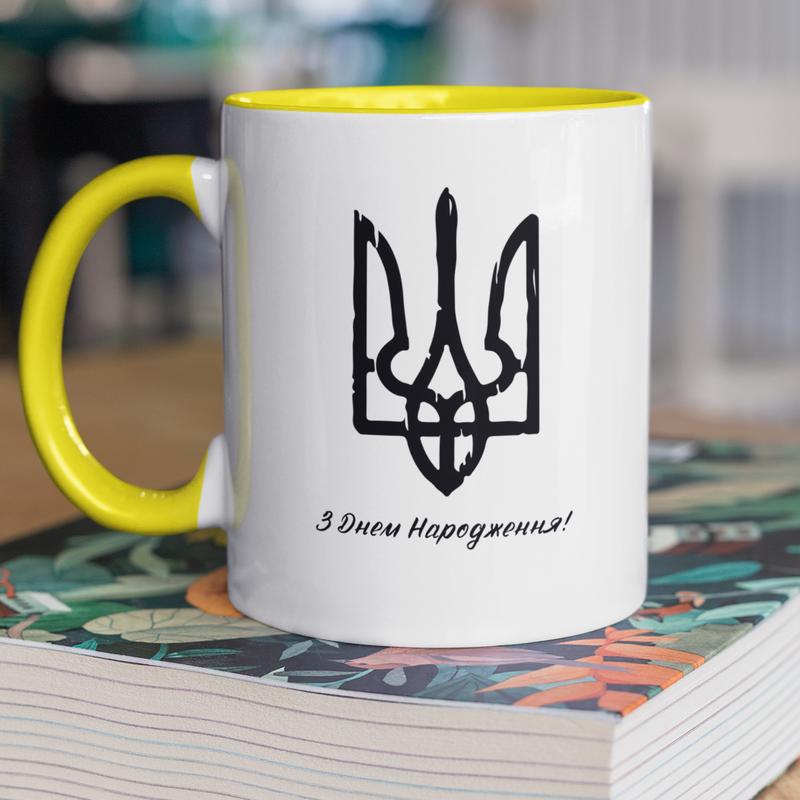 Чашка керамічна з принтом "з днем народження тризуб" 330 мл, біла з жовтою ручкою