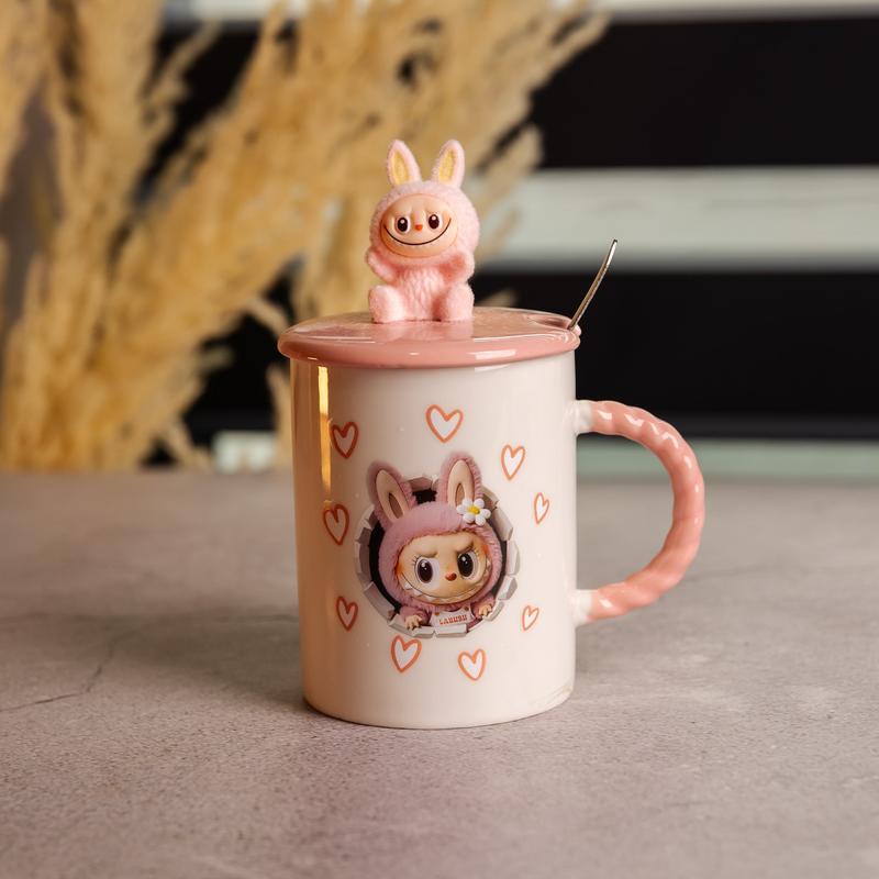 Порцелянова чашка labubu 300 мл з кришкою і ложкою, рожева — стильний подарунковий посуд