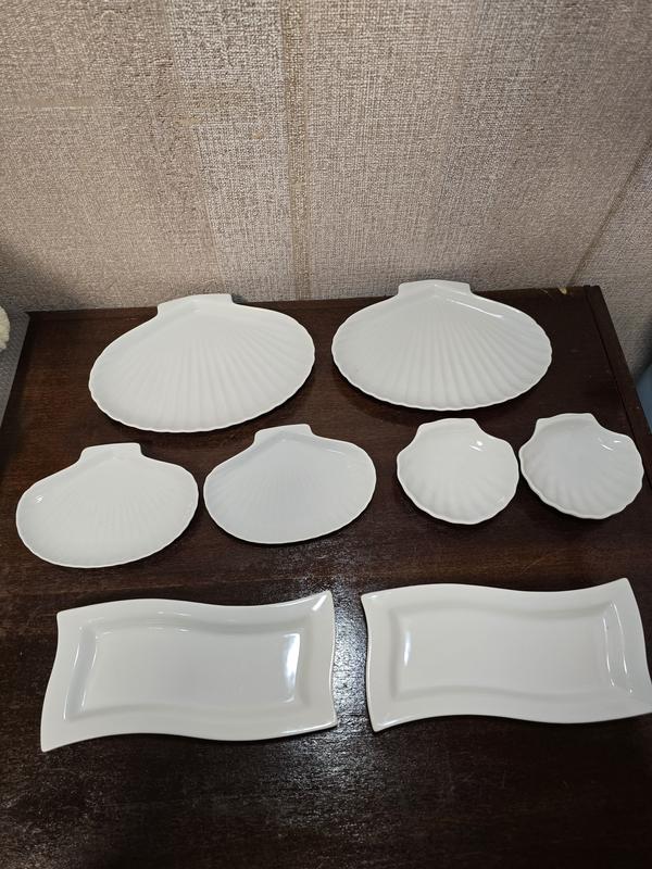 Набір білих порцелянових тарілок різних форм та розмірів від бренду Helfer. Продаю набором, або по 2 шт кожної одиниці. - хвилясті - 2шт - 220грн - ракушка велика 21см - за 2шт - 270грн - ракушка середня 15см - за 2шт - 210грн - ракушка маленька 10см - за 2шт - 120грн Якщо заберете усе зроблю знижку, відправляю поштою, запакую все добре.