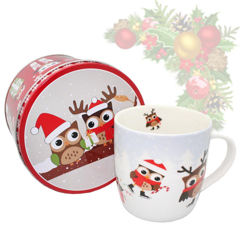 Кружка с фарфора с новогодним рисунком в металлической коробке «совы на коньках», 400 мл (...