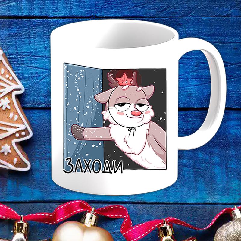 Біла кружка (чашка) з новорічним принтом Оленя "Заходь" Розцінки на кухлі (чашки): 1 шт 2 шт 3 шт 4 шт 5 шт 10 шт 20 шт 50 шт 100 шт 150грн 140грн 130грн 120грн 110грн 100грн 90грн 80грн 70грн