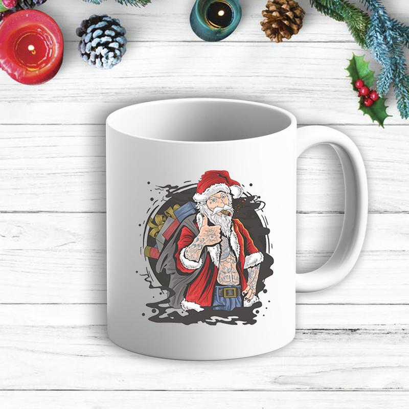 Біла кружка (чашка) з новорічним принтом дід мороз з сигарою і тату 2