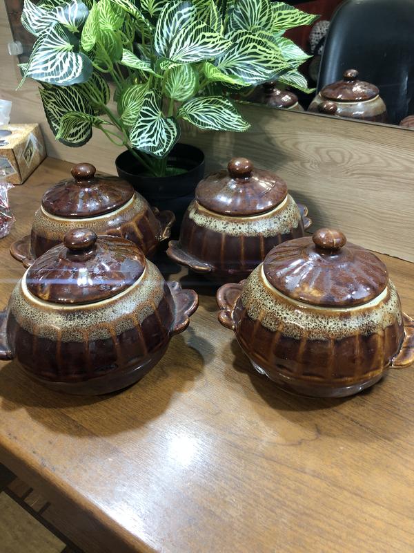 Цікавий набір глечиків з обливаної кераміки для запікання страв , або для зберігання спецій, в ідеальному стані. Заміри запитуйте в переписці.