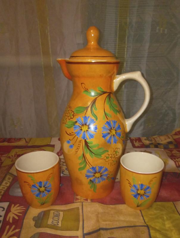 Большой, очень красивый кувшин с чашками. Роспись глазурь - керамика. Состояние нового, без изьянов.