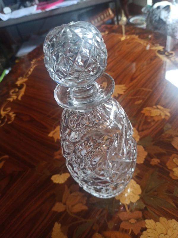Кришталевий декантер на 1,3літри.Складний візерунок робить його багатим на вигляд. Є ледве помітний скол на горлишку( збільшила щоб зробити фото), але якщо не знаєш- то і не помітно! Саме через це зменшена ціна. Насправді цей декантер є предметом найвищої якості виробництва Шотландії.