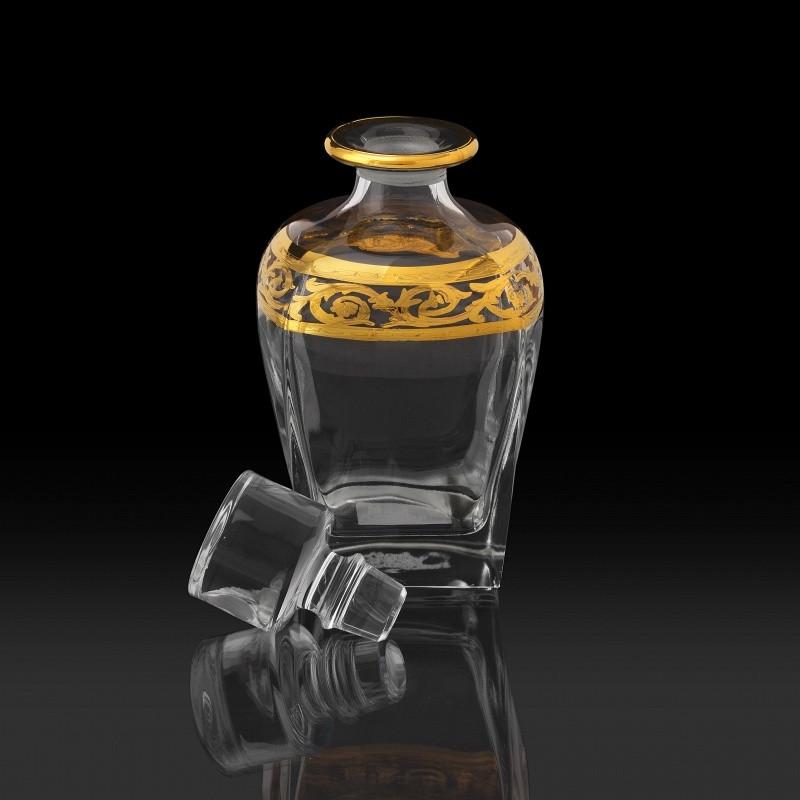 Оригінальний графин з товстим дном і масивною пробкою. Виготовлений з італійського скла. Витончений орнамент з 24-каратного золота виконаний вручну. Графин має вишуканий урочистий вигляд. Призначений для подачі на стіл міцних алкогольних напоїв. Однак довго зберігати їх в графині не варто.Об'єм його - 780 мл, діаметр верхньої частини - 55 мм. Графини, прикрашені малюнками з золота або платини, не слід мити в посудомийних машинах. Це роблять вручну з використанням м'яких губок і нейтральних мийних засобів.