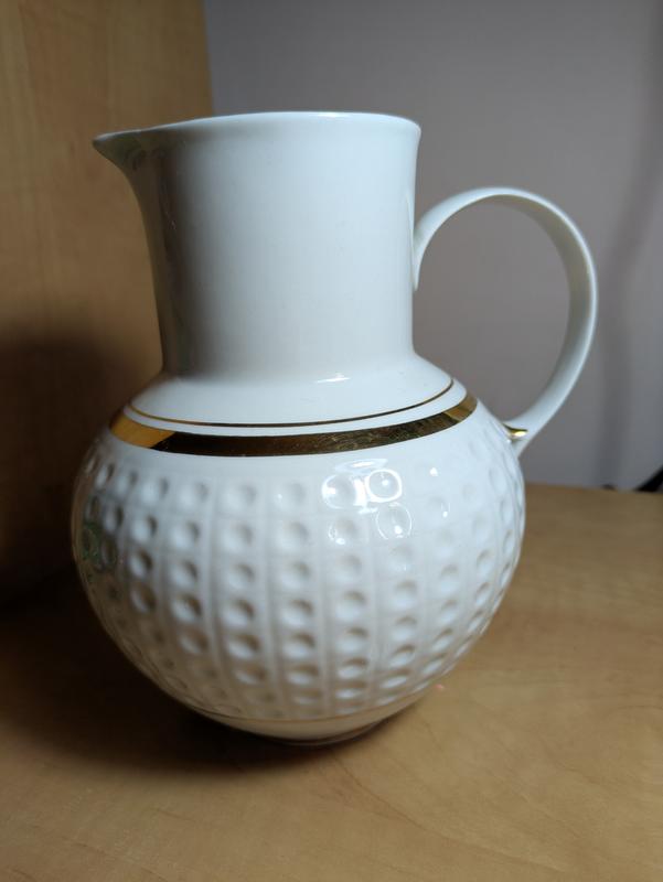 Вінтажний графин порцеляновий Коростень Об'єм 0.75 л Дуже добрий стан для свого віку. Є невеликі потертості позлоти на обідку та біля ручки Без тріщин, сколів