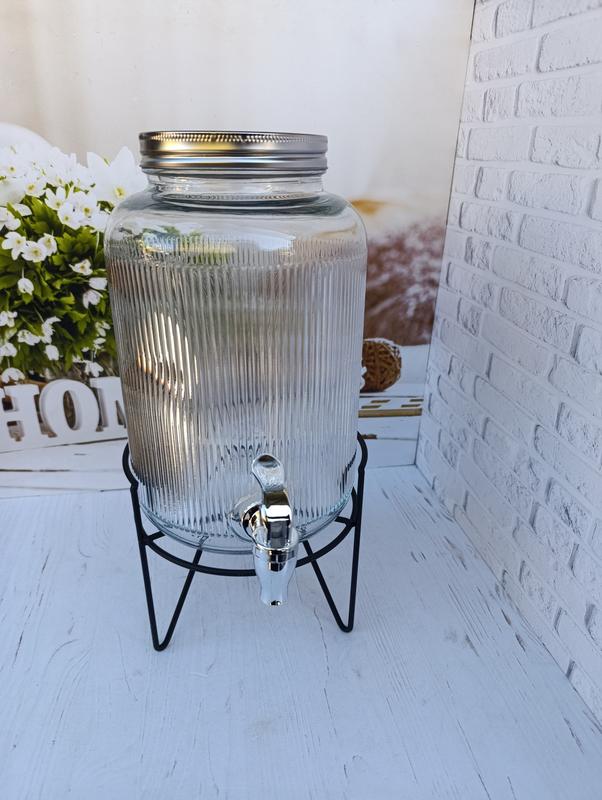 Ємність (банка) для лимонаду, соку, вина, освіжаючих напоїв з фруктами і цитрусовими. Об'єм 3,8л. Комплектується лимонадник кришкою з засувками і краном для зручного використання. Також в комплекті металева підставка мідного кольору. Таким графіном зможуть користуватися навіть діти, не підводячи важкий графін з напоєм. Матеріал графіна – Скло. Скляна ємність повністю безпечна і не схильна до впливу кислот і лугів, тому відмінно підійде для тривалого зберігання напоїв. Глечик для напоїв з краником (лимонадник) стане гідною прикрасою будь-якого свята, його можна взяти на природу і дачу, а також насолоджуватися кожен день вдома улюбленими напоями. Характеристики Тип поставки Один предмет Матеріал ємності Скло Об'єм 3.8 л Особливості На підставці Країна-виробник товару Китай