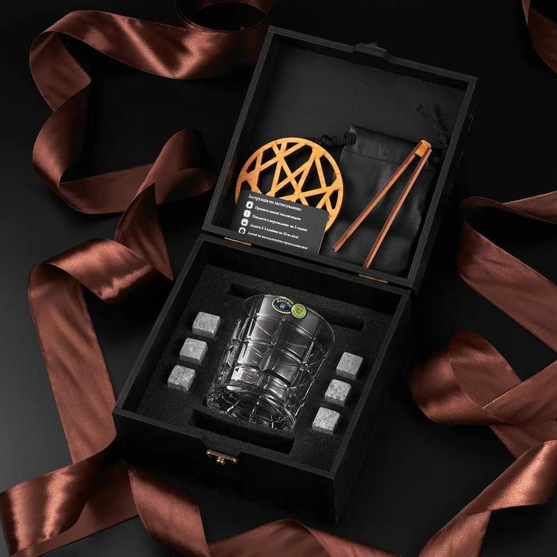 В набір входить! - Коробка дерев'яна + Келих Bohemia Timesquare 320 мл + мішечок + щипці + підставка - Матеріал каменів Стеатит (є сертифікат) - Країна США - Розмір каменів 2 см х 2 см х 2 см - Комплект Дерев'яна коробка, з гарним гравіюванням + мішечок - Розмір 20 см х 20 см х 11 см УВАГА!!! МИ ЄДИНСТВІ У КОГО ЕСТ СЕРТИФІКАТ ОРИГІНАЛЬНОСТІ НАШИХ КАМНЕЙ ДЛЯ ВИСКИ ІНТЕРЕСНІ ФАКТИ НАШИХ КАМНЕЙ!!! - Камені для віскі розкриють напій Для справжніх поціновувачів віскі не буде секретом, що цей елітний напій вимагає особливої уваги під час вживання. Щоб віскі розкрив весь свій букет, його температура має коливатися в межах від 18 до 20 градусів Цельсія. Оригінальні, ексклюзивні та колекційні сорти віскі не дають жодних добавок. Льодя, що розтікався, розбавить напій, переохолодить його та зіпсує смак. Для того, щоб отримати максимальне задоволення від повністю розкритого букета та відчути весь спектр ароматів, необхідно купити камені для віскі -- натурального походження стеатити, які найкраще підходять для охолодження віскі природним способом, без втрати смакових якостей. Камені для віскі продаються у формі невеликих кубиків, які після приміщення в морозильну камеру надовго зберігають свою температуру та охолоджують напій. Є єдиний спосіб охолодження віскі без його переохолодження й розведення водою -- купити камені для віскі. Вони являють собою невеликі кубики з природного непористого каменю (стеатит), який є хімічно інертним, не здатним вступати в реакції з напоями, спиртами. Камені для віскі, завдяки високій щільності стеатиту, чудово тримають температуру та дуже прості в застосуванні: досить помістити їх на кілька годин у морозильну камеру, а потім насолоджуватися не розбавленим охолодженим напоєм