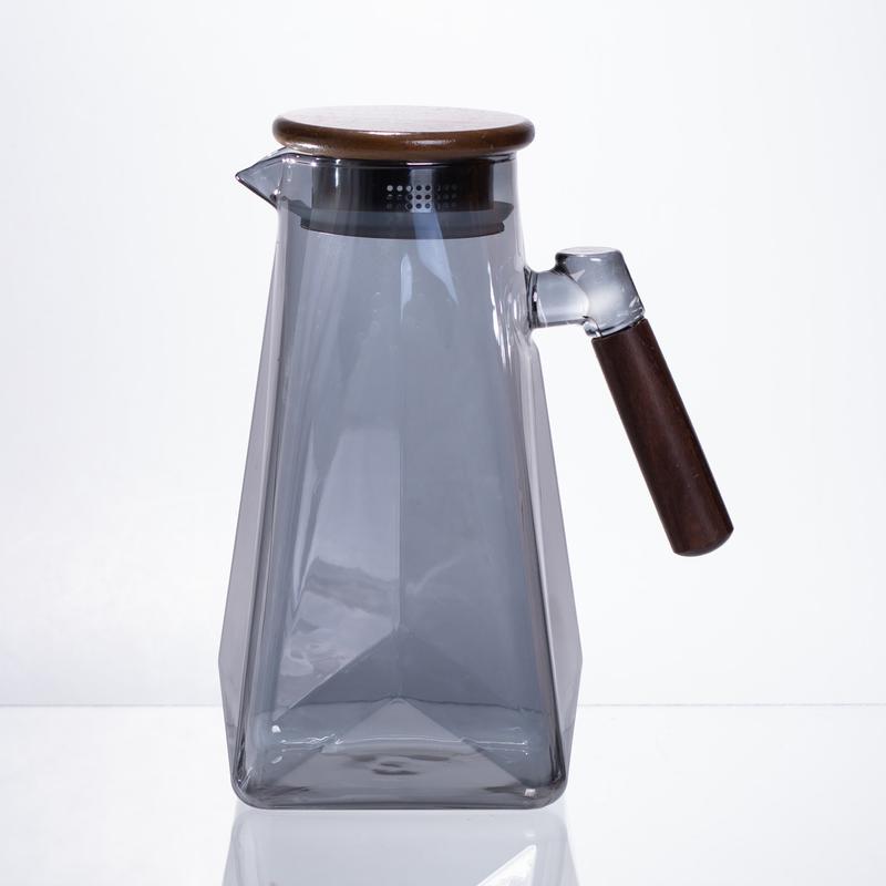 Скляний глечик для води та напоїв об'ємом 1,8 літра виготовлений з якісного скла з елегантним сірим відтінком, що додає посуду стильного сучасного вигляду. Завдяки оптимальному об'єму 1,8 л цей глечик ідеально підходить для подачі питної води, домашнього лимонаду, фруктового компоту або освіжаючого холодного чаю під час сімейних застіль або дружніх зустрічей. Скляний матеріал не поглинає сторонні запахи і не вступає в реакцію з напоями, забезпечуючи збереження їх натурального смаку і свіжого аромату. Кришка для глечика виготовлена з екологічного поєднання натурального бамбука та нержавіючої сталі. Кришка оснащена спеціальним ущільнювачем, який забезпечує герметичне прилягання до країв посуду, а вмонтоване ситечко дозволяє зручно наливати напої з фруктовими шматочками або трав'яними добавками без потрапляння частинок у склянку. Така продумана конструкція робить використання скляного глечика максимально практичним і гігієнічним. Ручка виконана з міцного бамбука темного кольору та надійно закріплена на скляній основі глечика. Ручка забезпечує комфортне тримання навіть при повністю наповненому посуді, не нагрівається від рук і не ковзає під час використання. Скляний глечик має висоту 23 см, верхній діаметр 8 см і вагу 600 грам, що робить його стійким на поверхні і водночас легким у повсякденному користуванні. Технічні характеристики скляного глечика: • Об'єм для напоїв: 1,8 літра; • Висота посуду: 23 сантиметри; • Верхній діаметр: 8 сантиметрів; • Вага глечика: 600 грам; • Матеріал корпуса: якісне скло; • Матеріал кришки: натуральний бамбук, нержавіюча сталь; • Матеріал ручки: натуральний бамбук.