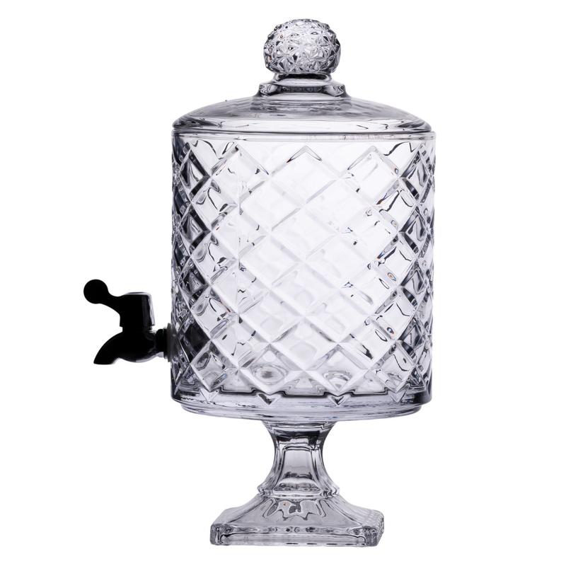 Елегантна лимонадниця з міцного скла ідеально підійде для подачі прохолодних напоїв на святковому столі, фуршеті або в повсякденній обстановці. Прозорі стінки з вертикальним рифленням надають виробу вишуканого вигляду, а кран забезпечує зручне наливання напоїв. Основні характеристики: Об'єм: 4.5 л; Висота: 39 см (висота без кришки - 31 см); Матеріал: скло; Верхній діаметр: 20 см; Нижній діаметр (основа-ніжка): 12×12 см. Особливості: Міцне і товсте скло, стійке до подряпин; Рельєфний дизайн надає святкового і вінтажного стилю; Зручний кран для дозованої подачі напою; Стійка основа на ніжці; Кришка щільно закривається, захищаючи напій від забруднень і комах. Ця стильна лимонадниця стане не тільки зручним аксесуаром на кухні або столі, а й вишуканим елементом сервірування. Ідеально підійде для подачі напоїв влітку, на святах, вечірках або просто для щоденного використання вдома чи в офісі. Зручність, місткість і красивий дизайн роблять її чудовим вибором для кожного будинку.