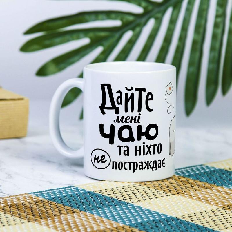 Біла чашка на подарунок з написом "дайте мені чаю та ніхто не постраждає" 330 мл