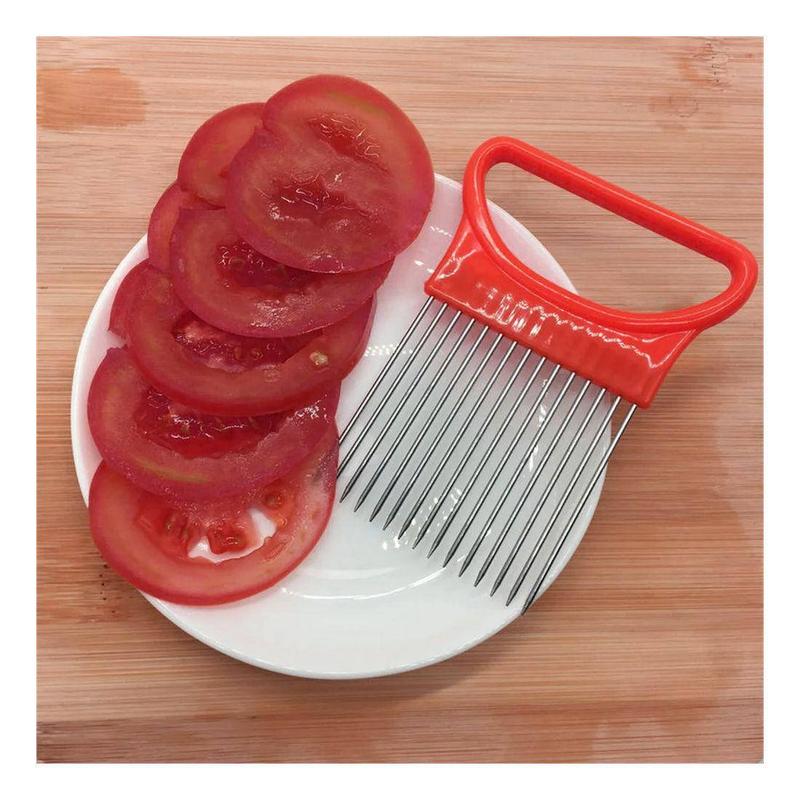 Держатель-слайсер для лука, томатов, картофеля и других овощей и фруктов, помогает в нарезке их ровными одинаковыми ломтиками.