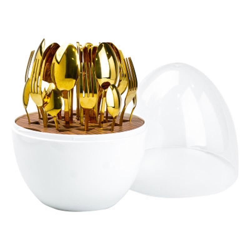 Цей вишуканий набір столових приборів, що складається з 24 предметів, стане справжньою окрасою вашої кухні. Виготовлені з високоякісної нержавіючої сталі з золотим покриттям, прибори вирізняються елегантним класичним дизайном та бездоганною якістю. Вони не тьмяніють з часом, зберігаючи блиск та красу протягом довгих років. Ергономічні ручки приборів зручно лягають в руку, роблячи процес вживання їжі комфортним. Доповнює набір елегантна підставка у формі яйця, яка не тільки економить місце на столі, але й додає елегантності сервіруванню. Цей набір столових приборів стане чудовим подарунком для близьких людей або доповнить вашу власну кухню, підкресливши ваш вишуканий смак та увагу до деталей. Він ідеально підходить як для щоденного використання, так і для святкових обідів, адже з ним будь-яка трапеза перетвориться на справжнє свято. Характеристики: Тип: набір столових приборів Матеріал: нержавіюча сталь Кількість осіб: 6 Столовий ніж: 6 шт Столова ложка: 6 шт Чайна ложка: 6 шт Столова вилка: 6 шт Особливості: з підставкою довжина ножів 22.5 см довжина столових ложок 20 см довжина вилок 20 см довжина чайних ложок 13.5 см