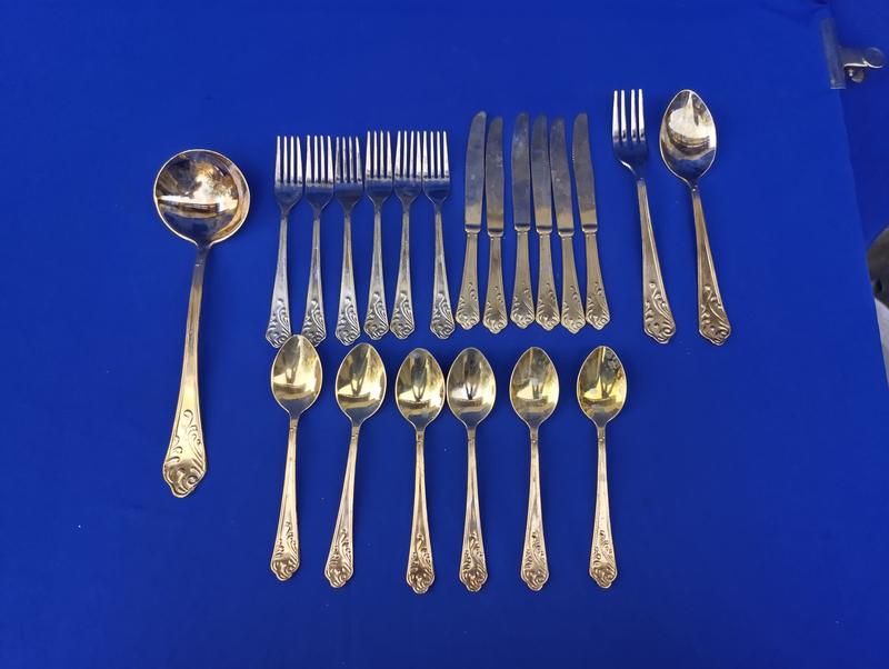 Ціна вказана за набір, все що на фото. стан гарний , без пошкоджень. Набор столовых предметов на 6 персон человек нож ножей лодка лодек вилка вилок половник салатная ложка вилка
