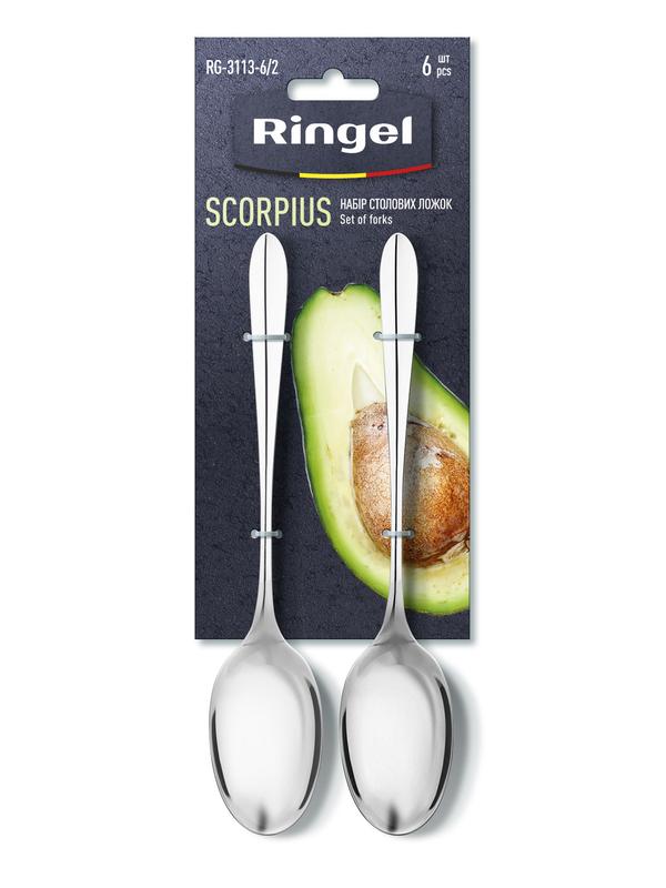 Набір столових ложок 6 шт Ringel Scorpius RG-3115-6/2 Характеристика: Кількість предметів: 6; Матеріал: нержавіюча сталь; Можна мити в посудомийній машині; Країна-виробник товару: фосфор Торгова марка RINGEL — приклад найкращого досвіду європейських виробників посуду та вміння забезпечити максимум якості за прийнятною ціною. Посуд від бренда RINGEL — ідеальний помічник на вашій кухні, щодня надихатиме вас на справжні кулінарні шедеври!