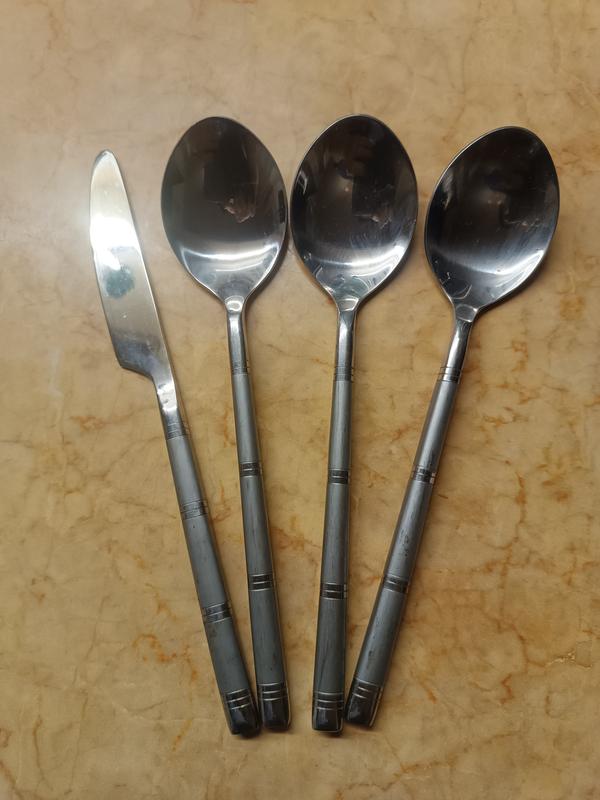 🧁 Набір столових приборів з Німеччини ✨ Вишуканий комплект: 3 ложки + 1 ніж 🔹 Матеріал: нержавіюча сталь 🔹 Дизайн: лаконічні ручки з трьома гравірованими кільцями 🔹 Стан: чудовий, без пошкоджень 🔹 Привезено з Німеччини — якість, що відчувається в кожній деталі 🔹 Ідеально для сервірування, фотозйомок або колекції 📏 Довжина: ~20 см (див. фото з рулеткою).