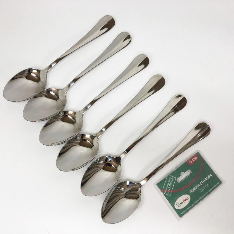 Набір столових ложок Con Brio 6 шт (CB-3209) - Кількість предметів: 6 шт. - Матеріал: нержавіюча сталь - Можна мити в посудомийній машині - Глянцеве полірування Набір столових ложок Con Brio CB-3209 - виконані з нержавіючої сталі, яка має високі гігієнічні та антикорозійні властивості, не схильна до впливу лугу та кислот, не впливає на смак їжі та легко миється. Сталь є міцним та довговічним матеріалом, тому посуд прослужить Вам довгий час та збереже привабливий зовнішній вигляд. Набір столових ложок Con Brio CB-3209 складається з шести ложок, виготовлених з нержавіючої сталі, що гарантує їхню міцність і стійкість до корозії. Ложки мають оптимальні розміри та ергономічну форму, забезпечуючи комфортне використання з різними стравами. Їх гладка поверхня та якісне оздоблення забезпечують легкість у догляді та довговічність виробу. Набір столових ложок Con Brio CB-3209 включає шість ложок, виготовлених з нержавіючої сталі, що забезпечує їх міцність і довговічність. Ложки мають оптимальні розміри та ергономічну форму, що підходить для різних страв. Гладка поверхня та якісне оздоблення спрощують догляд та зберігають естетичний зовнішній вигляд виробу. -