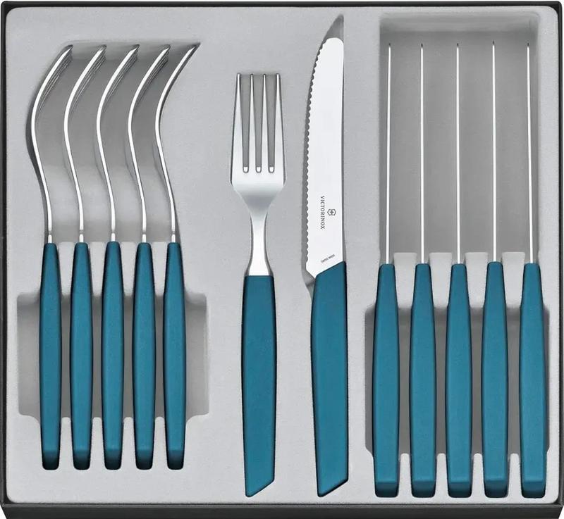 Набір столового приладдя Swiss Modern Table Set від швейцарського бренду Victorinox ідеально доповнить будь-який стіл своїм мінімалістичним, проте стильним дизайном та підійде для ваших посиденьок в колі друзів чи родини. Ручки столових приладів виготовлені з високоякісного поліпропілену. Це робить столове приладдя дуже легкими та приємним на дотик. Ергономічні руків'я не ковзають, що також є великим плюсом. Леза ножів виготовлені з нержавіючої сталі та мають серейторну крайку, яка є універсальною та підходить для нарізання м'яса, риби, овочів, фруктів, сендвічів та ін. Розширені набори включають в себе столові та чайні ложки, котрі як і виделки, виготовлені з комбінації поліпропілену та нержавіючої сталі, тому весь набір підходить для миття в посудомийній машині. Набори Swiss Modern Table Set доступні в декількох кольорах, тому кожен зможе підібрати набір, що пасуватиме його столу.