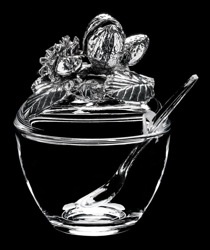 З першого погляду може здатися, що столові приладдя і посуд від компанії Wutschka дуже прості та нехитрі. Дійсно, хіба є щось надзвичайне в поєднанні олова та кришталю? Але варто придивитися - і Вам відкриється точність ліній, витонченість сполучень та сувора естетика цих виробів. Продукція Wutschka з зображеннями тварин і мисливською тематикою прикрасить святковий стіл будинку, або надасть неповторний стиль банкету в ресторані. З першого погляду може здатися, що столові прибори і посуд від компанії Wutschka дуже прості і нехитрі. Справді, хіба є щось незвичайне в поєднанні олова і кришталю? Але варто придивитися - і Вам відкриється точність ліній, вишуканість сполучень і сувора естетика цих виробів. Продукція Wutschka із зображеннями тварин і мисливською тематикою прикрасить святковий стіл дому, додасть неповторний стиль банкету в ресторані. Стильна кришталева ємність з кришкою. Прикрашена литтям у вигляді горіха.